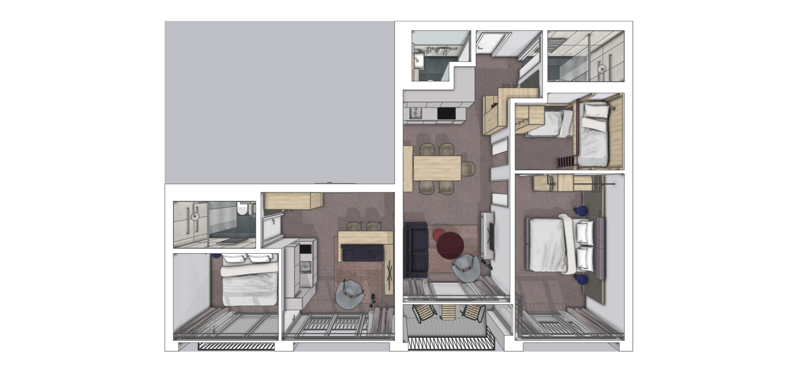 With approximately 53 m² of living space and a south-facing orientation, this 3-room apartment convinces with a panoramic view of the Engadine mountains and sunshine almost all day long. It offers space for five to seven people. One room is designed to be interior, without windows, and offers a protected, quiet sleeping area. The roof garden invites you to spend extended hours outdoors. Through a connecting door, the apartment can be combined with unit 4D – ideal for larger families or friendly couples. Pets are allowed.