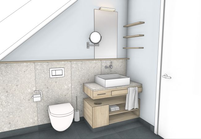The apartment has a functional bathroom with a shower, mirror, cosmetic mirror and towel rail - practically furnished for everyday life in holiday mode.
